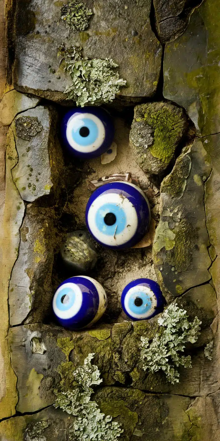 This unique wallpaper features a cluster of small blue evil eye beads embedded into a weathered stone wall. The rich blue hues of the eyes stand out against the natural moss and earthy textures, creating a peaceful and protective vibe. Perfect for those seeking a blend of nature and spiritual symbolism.