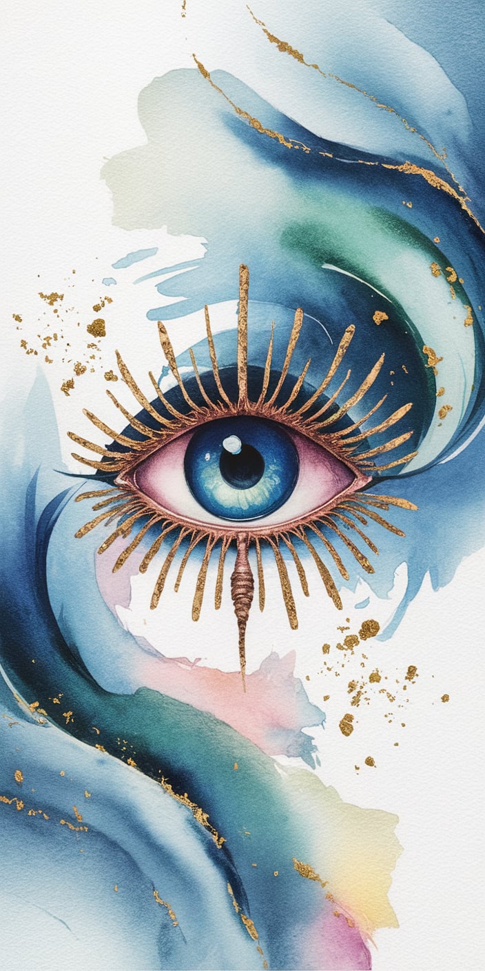This stunning watercolor wallpaper features a radiant blue eye encircled by golden rays and soft blue swirls. The combination of gold accents and fluid design creates a peaceful yet powerful effect. Perfect for those seeking elegance and protection.