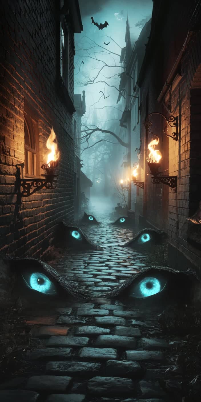 This haunting wallpaper features a foggy cobblestone alleyway with glowing blue eyes emerging from the mist. The flickering street lamps and dark brick walls add to the mysterious and eerie vibe. Perfect for those who love supernatural and edgy designs.