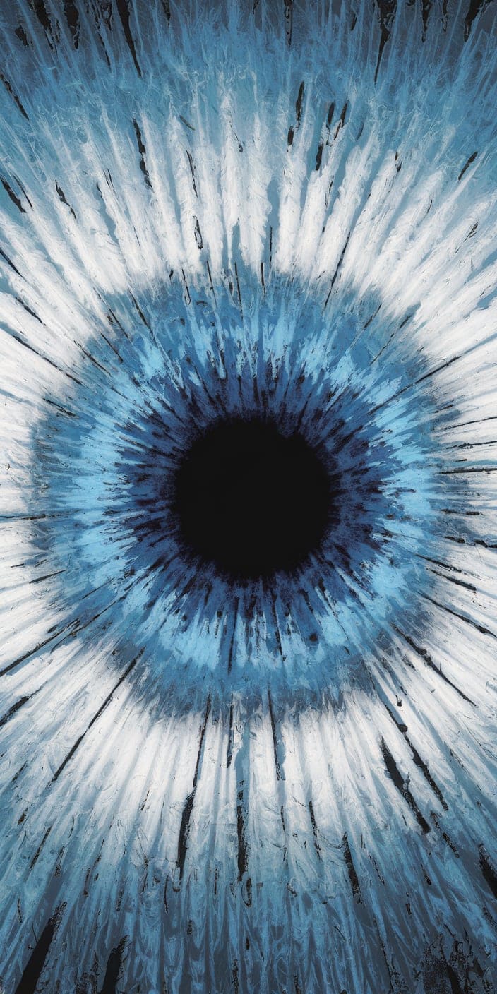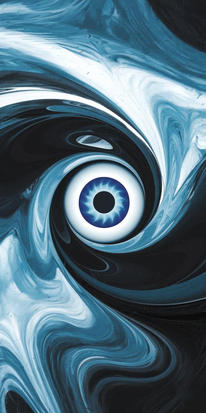 This abstract wallpaper features a swirling blue and white pattern with a striking central blue eye. The fluid movement of the swirls creates a sense of motion and depth, making it a bold yet calming background. Perfect for adding a mystical and modern vibe to your phone.