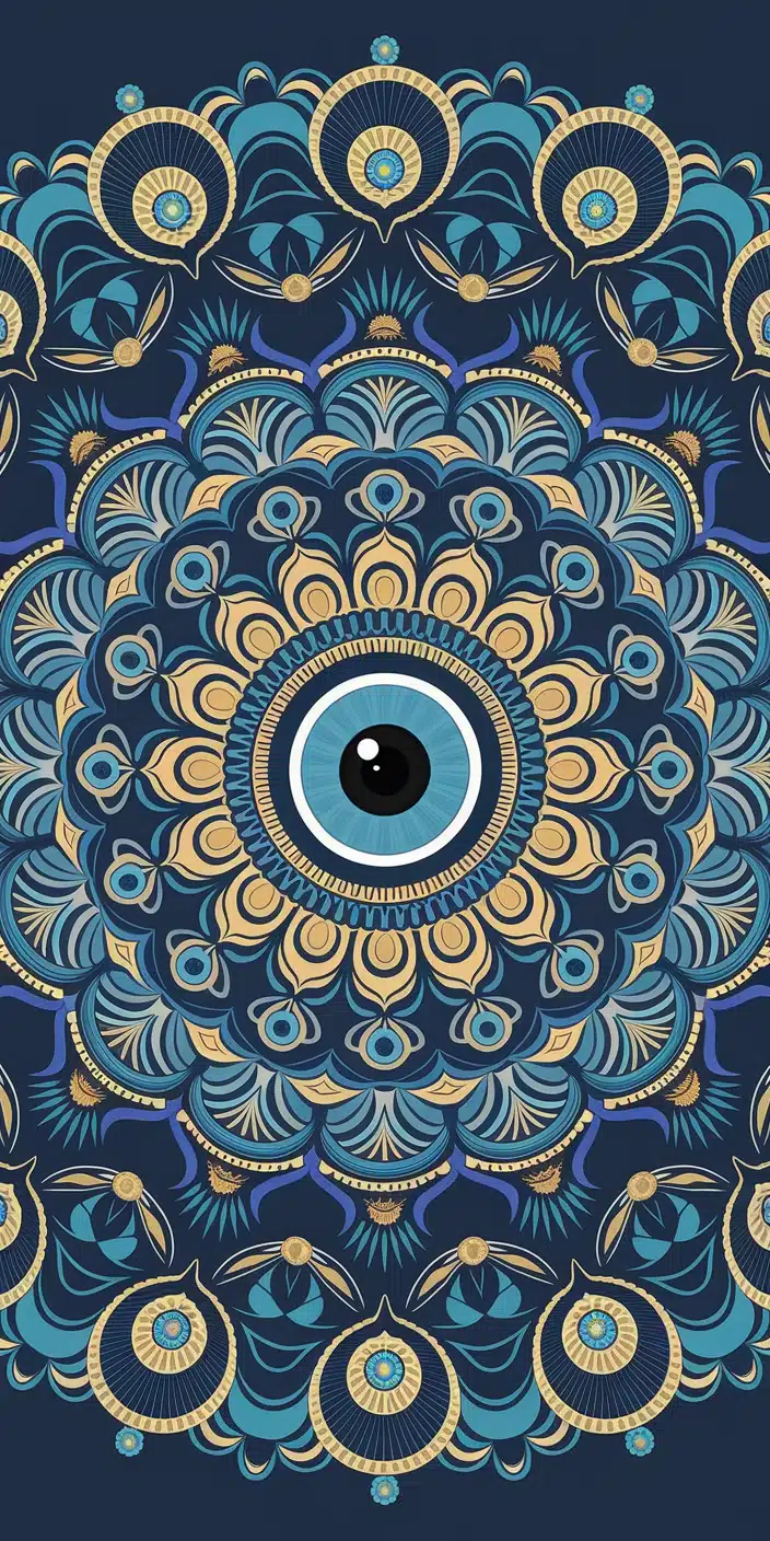 This detailed wallpaper features a striking mandala pattern with a blue evil eye at the center, surrounded by intricate gold and blue designs. The luxurious color palette and symmetrical design create a harmonious and protective effect. Ideal for those seeking elegance and spiritual symbolism.