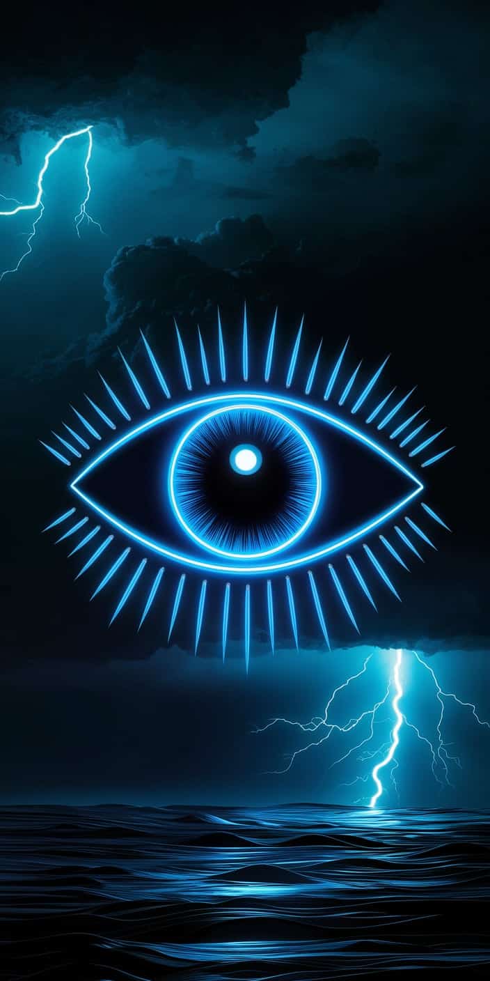 This bold wallpaper features a glowing neon blue evil eye floating above a stormy ocean with lightning bolts in the background. The vibrant blue glow contrasts with the dark clouds and water, creating a powerful and protective vibe. Perfect for adding cosmic energy and mysticism to your phone.