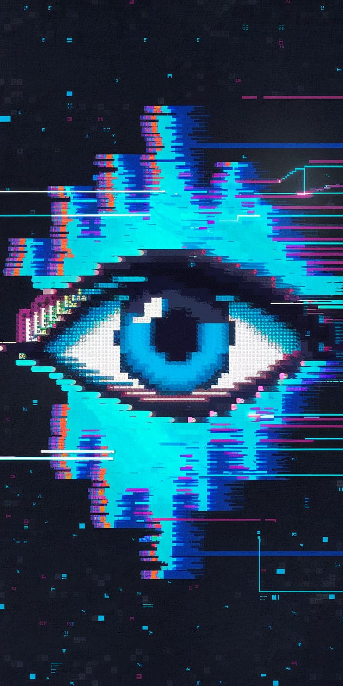 This modern wallpaper features a pixelated blue eye with glitch effects in shades of blue and purple. The high-tech, digital vibe adds a cool and futuristic feel to the traditional protective symbol. Ideal for those who love a modern aesthetic with spiritual undertones.
