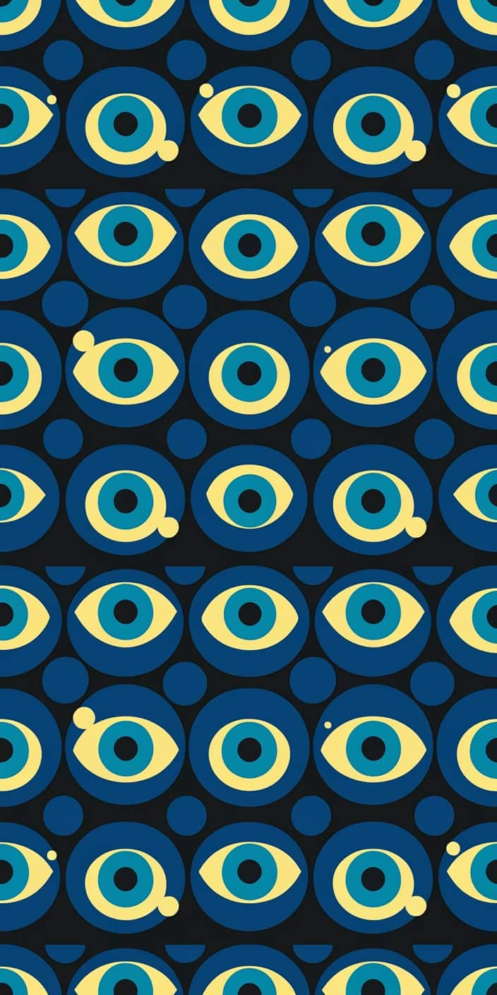 This retro-style wallpaper features a repeating pattern of stylized blue and yellow Evil Eyes. The bold geometric shapes and contrasting colors create a vintage yet modern feel. Perfect for adding a unique and protective vibe to your phone.